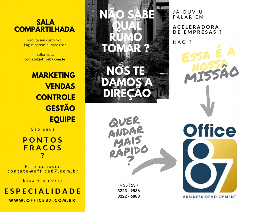 Já ouviu falar de aceleradora de empresas? Essa é a nossa missão! Adquira uma sala compartilhada, reduza seu custo fixo e pague apenas quando usar! Saiba mais em contato@office87.com.br. Marketing, vendas, controle, gestão, equipe… São seus pontos fracos? Fale conosco em contato@office87.com.br, essa é a nossa especialidade! Quer andar mais rápido? Ligue para um dos números: (13) 3223-9536 / (13) 3222-6888